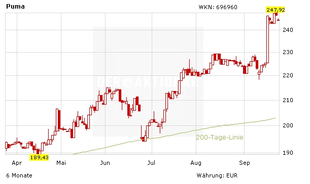 Auch DER AKTIONÄR hat sich in der aktuellen Ausgabe 39/16 mit den Übernahmegerüchten beschäftigt. Wie wahrscheinlich diese Übernahme werden könnte und wie viel Potenzial in den Aktien steckt, lesen Sie in der neuen Ausgabe. Doch eins vorweg: Die Aktien von Puma werden immer attraktiver und bieten eine ordentliche Rendite bei einem überschaubaren Risiko.