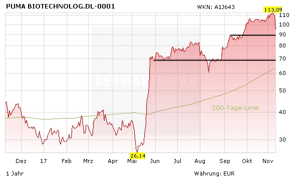 Vor Kurzem übertraf Puma Biotechnology die Schätzungen der Analysten – dennoch sackte die Aktie in der Spitze zwölf Prozent ab. Zu hoch waren die Erwartungen an Nerlynx der Martteilnehmer. Noch nicht investierten riskobewussten Anlegern bietet der Kursrücksetzer eine gute Einstiegsgelegenheit mit Stopp bei 86 Euro.