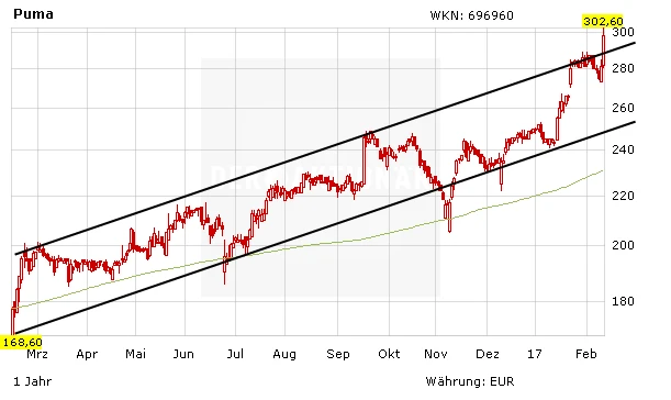 Puma bei fast 300 Euro – so lautete die Schlagzeile am Freitag. Damit hat die Aktie seit Mai 2015 113 Prozent zugelegt. Mittlerweile ist das KGV auf 53 angewachsen. Auch wenn Puma deutlich mehr wächst als Adidas und Nike, kann man ohne Zweifel sagen: Da steckt sehr viel Fantasie im Aktienkurs.