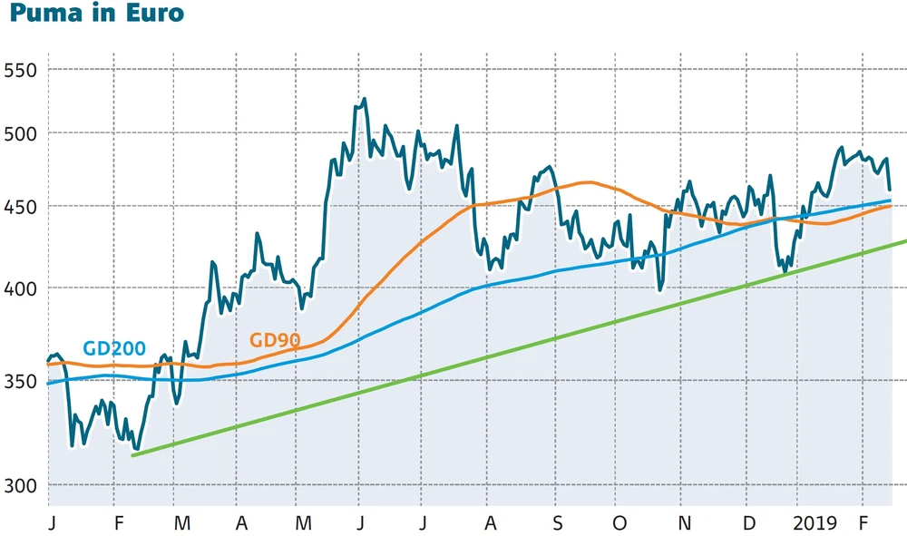 Der Kurssturz basiert eher auf Gewinnmitnahmen als auf totaler Enttäuschung des Marktes. Mit einem 2020er-KGV von 22 und einem Enterprise-Value/Erlöse-Verhältnis von 1,3 ist die Aktie klar günstiger bewertet als die amerikanischen Konkurrenten Nike und Under Armour. Nicht zu vergessen: Im Juli 2018 enttäuschte Puma bei der Umsatzprognose, um sie drei Monate später anzuheben. Keine Panik also, dabei bleiben.