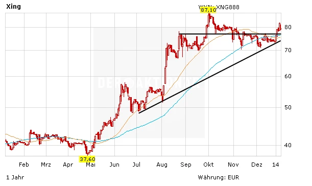 Charttechnisch hat Xing jetzt erneut ein klares Kaufsignal geliefert: Der Bereich bei 77 Euro sowie die 38- und 90-Tage-Linie wurden übersprungen. Fällt nun auch noch nachhaltig die psychologisch wichtige 80-Euro-Marke, sind weitere Kursgewinne vorprogrammiert.