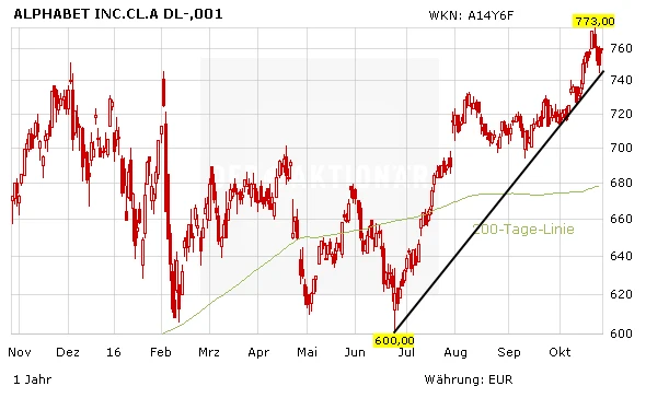 Ein wachsendes Kerngeschäft und genügen Cash für Investitionen in Zukunftstechnologien machen Google so stark wie nie zuvor. Im gemeldeten Quartal legte die Aktie um 16 Prozent zu. Seit Oktober um drei Prozent. Zuletzt verlor das Papier leicht. Aber mit den aktuellen Zahlen kann die Google-Rallye weitergehen. Kursziel 1.000€