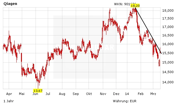 Die seit Anfang 2014 gültige Abwärtstrendlinie wurde bereits übersprungen. Gelingt der nachhaltige Ausbruch, würde sich die charttechnische Situation weiter aufhellen. Auch die Aussicht auf ein stärkeres Wachstum nach Abschluss der Umstrukturierung dürfte Qiagen weiter beflügeln. Investierte Anleger bleiben dabei. Auch für einen Neueinstieg ist es noch nicht zu spät. Ein Stopp bei 13,70 Euro sichert die Position weiterhin nach unten ab.