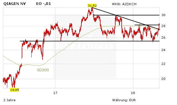 Die Aktie des Gendiagnostik- und Biotechunternehmens Qiagen nimmt wieder Fahrt auf. Nach Veröffentlichung der jüngsten Quartalszahlen hat das Papier die 200-Tage-Linie und auch den horizontalen Widerstand im Bereich von 28 Euro überwinden können. Geschäfte mit seinen Testverfahren und Diagnostik-Plattformen, aber auch günstige Währungseffekte sorgten in den ersten drei Monaten des Jahres für Rückenwind. Nach einem Verlust im Vorquartal wegen der US-Steuerreform schrieb Qiagen auch unter dem Strich wieder schwarze Zahlen. Operativ hat der Biotechkonzern seinen Quartalsgewinn auf 47,9 Millionen Dollar mehr als verdoppeln können. Der bereinigte Gewinn je Aktie (EPS) stieg von 0,22 auf 0,26 Dollar und lag damit über den Erwartungen der Analysten. Den Umsatz hat Qiagen im Berichtszeitraum im Vergleich zum Vorjahr um zwölf Prozent auf knapp 344 Millionen Dollar steigern können. Für das Gesamtjahr sieht Unternehmenschef Peer Schatz Qiagen auf Kurs und bestätigte die Ziele. Für das zweite Quartal stellt Qiagen nun ein Umsatzplus von fünf bis sechs Prozent zu konstanten Wechselkursen in Aussicht. Beim bereinigten EPS werden 0,31 bis 0,32 Dollar je Aktie zu konstanten Wechselkursen angepeilt. Für das Gesamtjahr stellt Qiagen auch dank der Übernahme des Diagnostikunternehmens Stat-Dx unverändert ein Umsatzplus von sechs bis sieben Prozent und ein bereinigtes EPS von 1,31 bis 1,33 Dollar je Aktie in Aussicht. „Mit unseren Ergebnissen für das erste Quartal starten wir für 2018 in ein spannendes Wachstumsjahr", kommentierte Schatz.