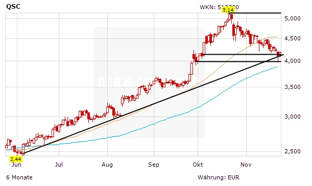 Seit dem Hoch bei 5,14 Euro konsolidiert die QSC-Aktie die vorangegangene Kursrallye. Als erste Anlaufstelle dient nach unterschreiten der Kreuzunterstützung im Bereich um 4,20 Euro die horizontale Linie bei 4,00 Euro. Kann der Kurs hier wieder nach oben drehen, dürfte es schnell in Richtung der alten Höchststände gehen.