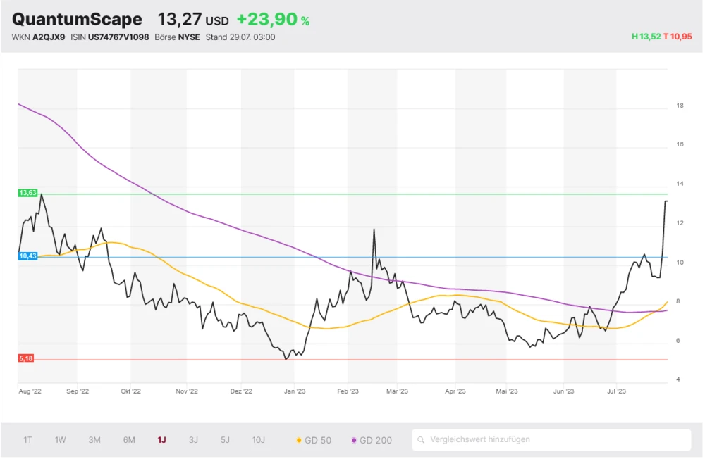 Die Kursrally beim amerikanischen Festkörper-Batterieentwickler QuantumScape geht unvermindert weiter. Darüber dürfte sich der mit 18 Prozent beteiligte VW-Konzern freuen. Auf Jahressicht hat der Anteilsschein von QuantumScape 145 Prozent zugelegt, am Freitag explodierte der Kurs um knapp 24 Prozent – das ist der Grund.