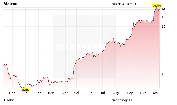 Nach der geplatzten Übernahme durch einen chinesischen Investor und dem Abschied von Vorstand Martin Goetzeler lag die Aixtron-Aktie am Boden. Teure Forschungsaktivitäten und leere Orderbücher sorgten bei dem Hersteller von LED-Fertigungsanlagen für tiefrote Zahlen. Aufsichtsratschef Kim Schindelhauer und der neue Vorstandschef Felix Grawert haben das Ruder aber herumgerissen. Im dritten Quartal wurden erstmals wieder schwarze Zahlen geschrieben. Geholfen hat ein Zahlungseingang für Lieferungen aus Vorjahren.