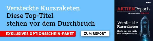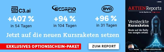 Herausgekommen sind 4 Top-Aktien, die DER AKTIONÄR nun in einem exklusiven Aktien-Report zusammengefasst hat und die das Zeug dazu haben, zu den Highflyern von morgen zu zählen. Das ist Ihre Chance, in den kommenden Wochen und Monaten satte Gewinne einzufahren, wie der Erfolg der vergangenen Reports mit C3.ai (+407 % in 54 Tagen), BYD (+96 % in 31 Tagen) und Scorpio Tankers (+94 % in 104 Tagen) eindrucksvoll beweist.