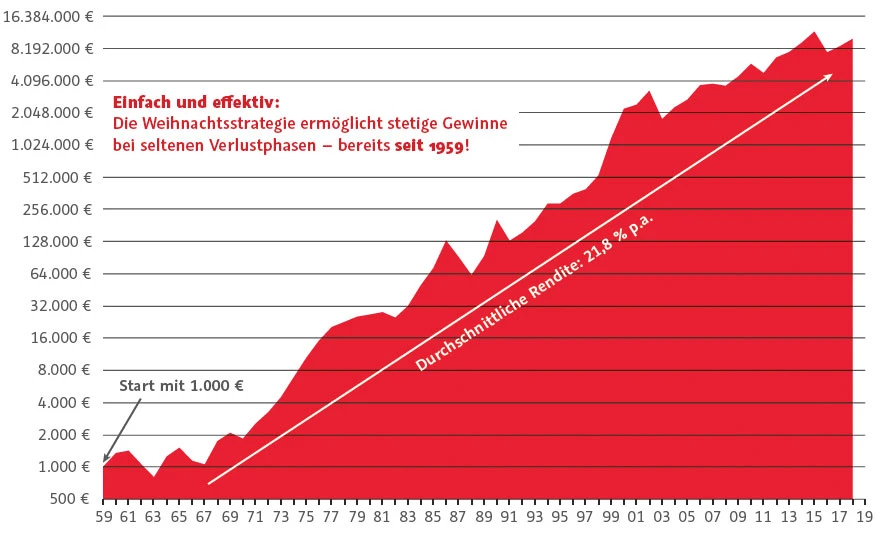 Die ultimative Weihnachtsstrategie geht in die nächste Runde. Auch in diesem Jahr bietet sich wieder die Chance, in nur 3 Wochen durchschnittlich 1.000 Euro zu gewinnen. Wenn Sie kurz vor den Feiertagen noch nach einer Möglichkeit suchen, Ihr Konto etwas aufzubessern, ist der Spezialreport zur Weihnachtsstrategie von Dr. Dennis Riedl und seinem Team genau das Richtige. Profitieren Sie alle Jahre wieder – bei einer Trefferquote von 78 Prozent!