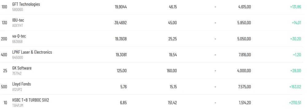 Lloyd Fonds haben nur die wenigstens Investoren auf dem Zettel. Ein Fehler. Vorstand Achim Plate hat die Gesellschaft ohne großes Aufsehen neu ausgerichtet und zu einem bankenunabhängigen Asset Manager und Vermögensverwalter mit einem gehörigen Schuss Fintech geformt. Das Real-Depot ist bei dieser Neuaufstellung und Neubewertung quasi von Anfang an dabei gewesen. Die Ausdauer macht sich bezahlt: Die Position liegt nach ersten Teilgewinnmitnahmen starke 163 Prozent im Plus. Mit dem Rest soll auf eine Fortsetzung der Erfolgsgeschichte und der Aufwärtsbewegung spekuliert werden.