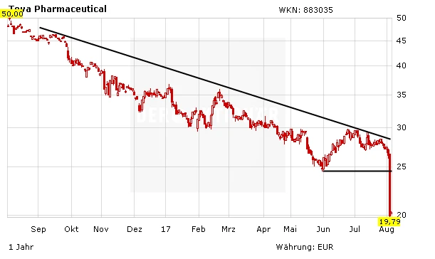 Die Negativschlagzeilen zu Teva, dem größten Generikahersteller der Welt, reißen nicht ab: Mit der gestrigen Zahlenvorlage verkündeten die Israelis einen Milliardenverlust. Gleichzeitig schraubte der Konzern die Prognose massiv nach unten. Die Teva-Aktie brach um satte 25 Prozent ein.