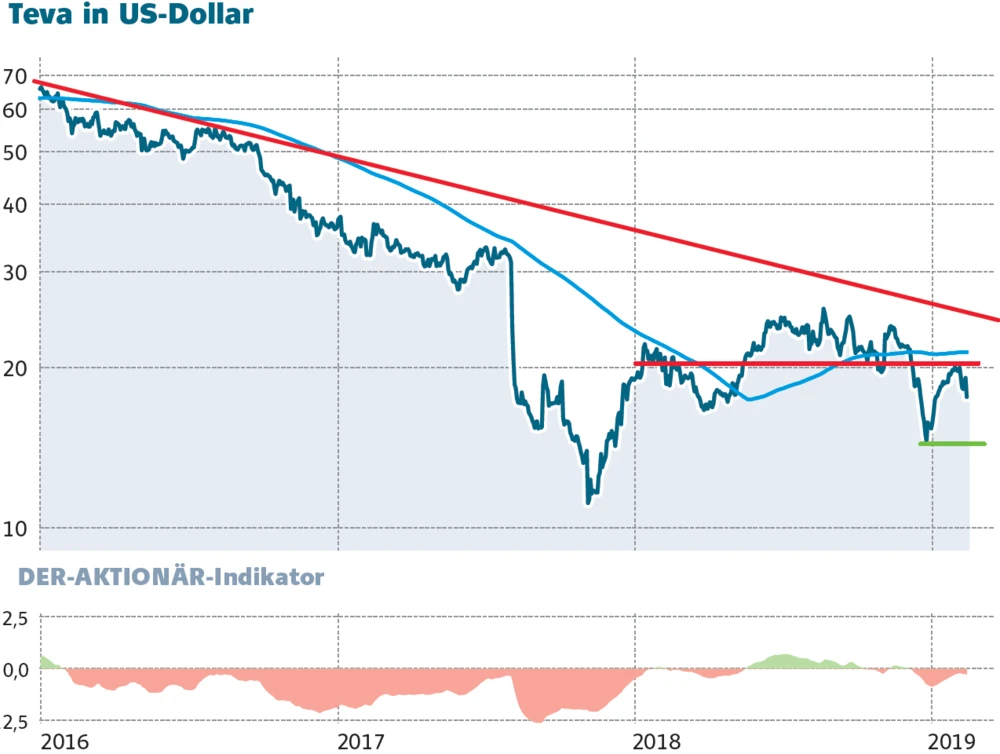 Nach Bekanntgabe der Zahlen zum vierten Quartal brach die Teva-Aktie im gestrigen Handel zwischenzeitlich zweistellig ein, mit einem Verlust von 7,8 Prozent auf 17,63 Dollar schlossen die Papiere. Auch wenn der Pharma-Titel mit einem Kurs-Gewinn-Verhältnis von 6 für 2019 lockt – die Risiken bleiben nach wie vor hoch. Daher sollten Anleger weiter einen Bogen um die Teva-Aktie machen.