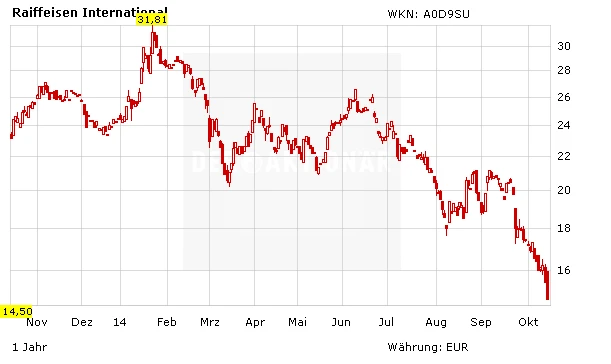 Die Aktie der Raiffeisen Bank International (RBI) kennt seit knapp einem Monat nur eine Richtung. In diesem Zeitraum hat das Papier der Großbank fast ein Drittel an Wert verloren. Zugegeben, es gab zuletzt auch schlechte Nachrichten aus Wien. So musste der Konzern kürzlich einräumen, 2014 wohl einen Verlust ausweisen zu müssen – den ersten in der Firmengeschichte. Dem stark auf die zentral- und osteuropäischen Märkte fokussierten Kreditinstitut machen vor allem die Töchter in Ungarn, Russland und in der Ukraine zu schaffen.