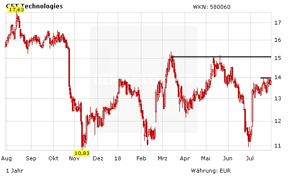 Passend dazu wurde Anfang Juli mit V-NEO ein erfahrener Anbieter integrierter IT-Lösungen für die Versicherungsbranche übernommen. Zu den Kunden der Kanadier zählen große Versicherer aus Kanada, Belgien und Frankreich. Mit dem Zukauf gelingt GFT die weitere Diversifizierung des Kundenportfolios – also der nächste Schritt zur Reduktion der Abhängigkeit von den zuletzt arg gebeutelten Kunden aus der Bankenbranche. „Der Softwarekonzern stärkt sein Geschäft im Versicherungsbereich und zugleich seine Präsenz in Nordamerika“, stimmt Andreas Wolf von Warburg Research zu. „Die Transaktion eröffnet Möglichkeiten zum Querverkauf anderer Softwarelösungen“, führt der Analyst aus. Er sieht sich in seiner positiven Einschätzung bestätigt – und die Aktie erst bei 17 Euro fair bewertet.
