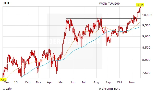 Die Aktien reagieren entsprechend. Während die Papiere von TUI-Travel unter Druck stehen, kann die MDAX-Aktie weiter zulegen. Nachdem die TUI-Aktie in den vergangenen Monaten mehrmals an dem Widerstand knapp unter der 10-Euro-Marke scheiterte, ist der Ausbruch nun endlich gelungen. Nach dem letzten Rücksetzer hat sich bereits seit Anfang September ein stabiler Aufwärtstrend ausgebildet. Die nächste charttechnische Hürde wartet nun erst im Bereich um elf Euro. DER AKTIONÄR spekuliert im Real-Depot mit einem TUI-Wave-Call (WKN DX6 9DG) von der Deutschen Bank weiter auf steigende Kurse.