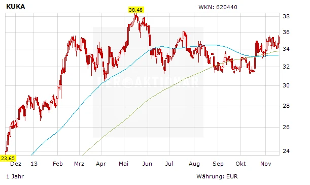 Mit dem Sprung über den kurzfristigen Abwärtstrend bei 34,70 Euro hat die Aktie zudem ein neues Kaufsignal generiert. Nun warten die nächsten Widerstände bei 36 und 38,50 Euro. Da die Aktie auch aus charttechnischer Sicht vor einem neuen Kaufsignal steht, spekuliert der DER AKTIONÄR seit Dienstag im Real-Depot mit einem KUKA Turbo-Long (WKN CF386E) von der Citigroup mit Hebel auf steigende Kurse.