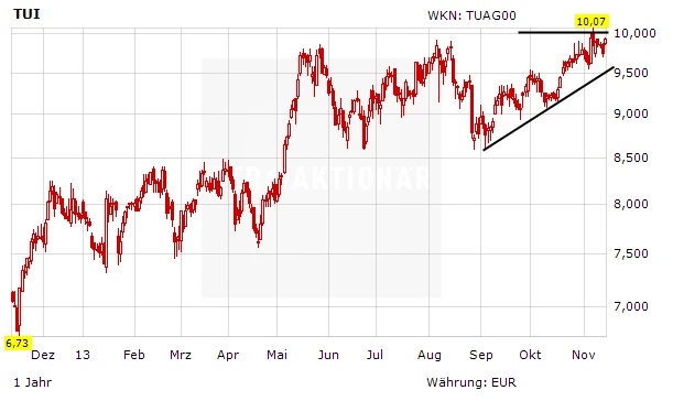 Seit Monaten pendelt der Kurs von TUI in einer Seitwärtsrange zwischen 8,60 und 10,00 Euro. Bereits zwei Mal prallte der Kurs an dem massiven horizontalen Widerstand an der 10-Euro-Marke ab. Nach dem letzten Rücksetzer hat sich seit Anfang September ein stabiler Aufwärtstrend ausgebildet.
