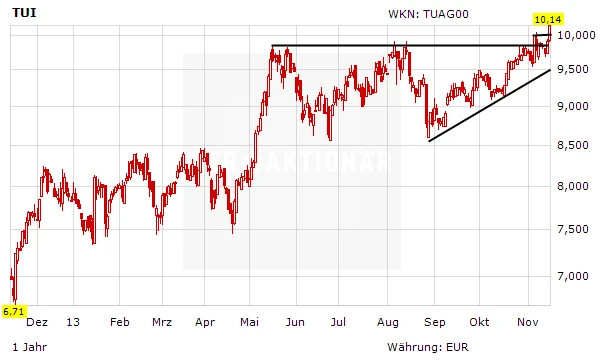 Nachdem TUI in den vergangenen Monaten mehrmals an dem Widerstand bei der 10-Euro-Marke scheitere, ist der Ausbruch nun endlich gelungen. Nach dem letzten Rücksetzer hat sich bereits seit Anfang September ein stabiler Aufwärtstrend ausgebildet. Mit dem neuen Jahreshoch wurde ein Kaufsignal ausgelöst, dass Anschlussgewinne nach sich ziehen sollte. Erst bei 11,00 Euro wartet aus charttechnischer Sicht die nächste Hürde.