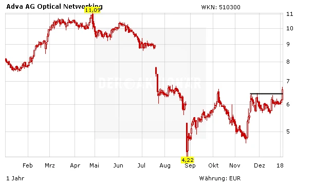 Insgesamt könnte das Jahr 2018 der Wendepunkt für den Netzwerkinfrastruktur-Spezialisten werden. Wichtig für die kurzfristige Kursentwicklung wird das Abschneiden im abgelaufenen Schlussquartal 2017. Hier peilt die Gesellschaft bei einem Umsatz zwischen 115 Millionen und 130 Millionen Euro auf Proforma-Basis beim Betriebsergebnis einen Gewinn von bis zu fünf Prozent vom Umsatz an. Erste belastbare Zahlen und einen Ausblick auf das Q1 2018 will ADVA am 22. Februar veröffentlichen.