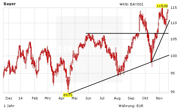 Aus charttechnischer Sicht würde der Sprung auf ein neues Hoch weitere Fantasie freisetzen. Die laufende Aufwärtsbewegung dürfte sich mit dem Ausbruch über die Marke von 114,75 Euro daher noch einmal beschleunigen. Zudem sichert die massive Unterstützung bei rund 106,50 Euro den Kurs vor Rücksetzern ab.