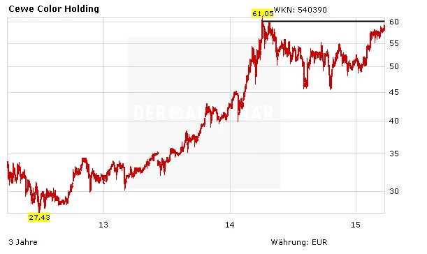 Die Aktionäre können mit einer höheren Dividendenzahlung für 2014 rechnen. Sie soll um fünf Cent auf 1,55 Euro pro Aktie angehoben werden. Auf Basis des aktuellen Kurses entspricht das einer Dividendenrendite von 2,6 Prozent. Die Hauptversammlung ist am 3. Juni in Oldenburg. DER AKTIONÄR spekuliert im Real-Depot mit Hebel auf steigende Kurse bei CEWE. Der Fahrplan bleibt einfach: Kommt der Ausblick am Markt gut an, dürfte die Aktie weiter durchstarten. Dann wird der Stopp nachgezogen und die Position bleibt im Depot. Fällt der Kurs dagegen zurück, wird die Position zeitnah glattgestellt.
