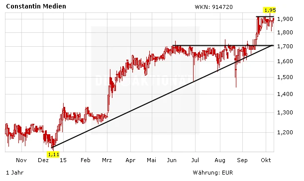 Burgener weiter: „Die Kursperformance der vergangenen Monate ist erfreulich, aber sicher nicht das Ende unserer Vorstellungen.“ Auch Analyst Silbe ist „sehr positiv eingestellt“ und berechnet ein Kursziel von 2,50 Euro. DER AKTIONÄR sieht auf 12-Monats-Sicht bei erfolgreichem Verlauf der Kinosaison die Chance auf noch höhere Kurse. Zumal bei dem Real-Depot-Wert nun endlich der Ausbruch aus der Seitwärtsbewegung ansteht.