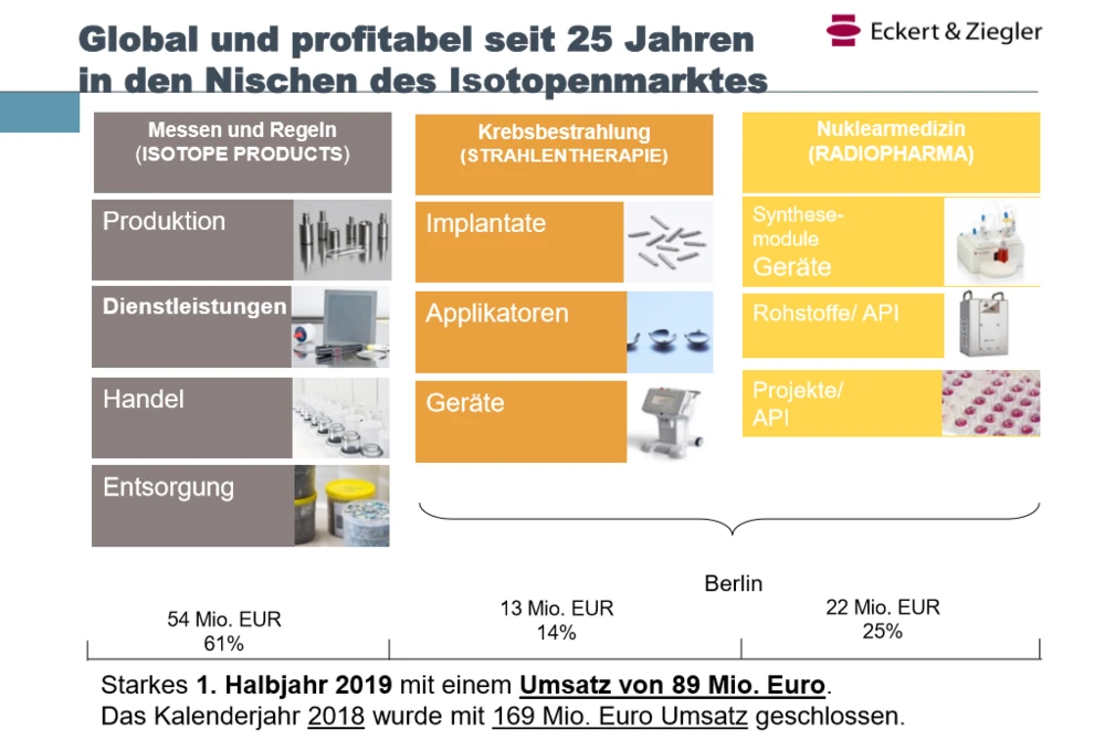 Eckert & Ziegler gehört zu den weltweit größten Herstellern von radioaktiven Komponenten für medizinische, wissenschaftliche und messtechnische Zwecke – und konzentriert sich auf Anwendungen in der Krebstherapie, der industriellen Radiometrie und der nuklearmedizinischen Diagnostik. Der Markt ist stark reguliert, die Markteintrittsbarrieren entsprechend hoch. Zu den Kunden zählen vor allem internationale Medizingerätehersteller und Kliniken.