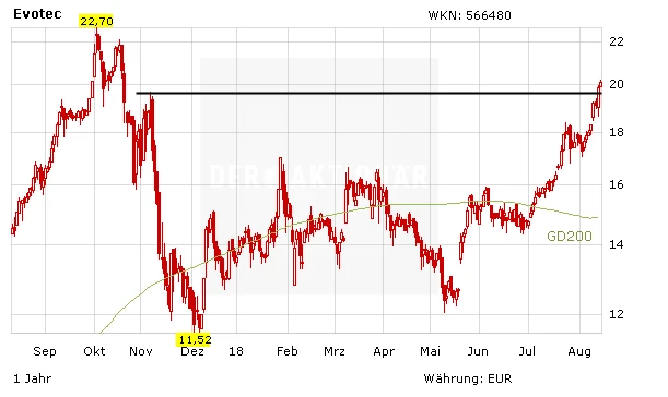 Die Aktie von Evotec ist derweil nicht zu bremsen. Nachdem der Wert bereits in den vergangenen Tagen deutlich zulegen konnte, gelingt am heutigen Dienstag der Sprung über die 20-Euro-Marke. Beflügelt wird der Wert neben den News des Partners Haplogen von der bestätigten Kaufempfehlung aus dem Hause Bankhaus Lampe. Sie messen der Aktie weiterhin Potenzial bis in den Bereich von 26 Euro bei. Die Analysten sehen Evotecs Position gestärkt, wenn es darum geht, Verträge mit neuen Partnern zu verhandeln. Auch DER AKTIONÄR bleibt bei seiner optimistischen Einschätzung zu der Aktie. Seit der Empfehlung im November 2017 notiert das Papier bereits mehr als 50 Prozent im Plus. Anleger lassen angesichts der hervorragenden langfristigen Aussichten die Gewinne weiter laufen.