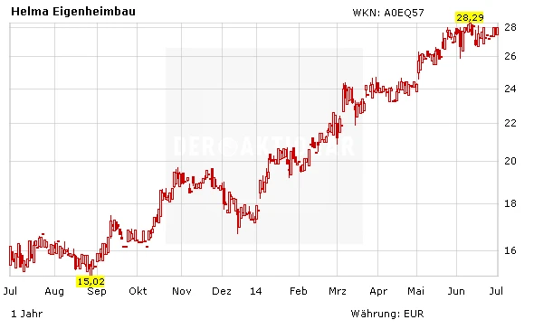 Helma Eigenheimbau wächst seit Jahren mit zweistelligen Raten. Der Anstieg der Nettoauftragseingänge bietet eine gute Grundlage für eine Fortsetzung des Trends. Neben dem Geschäft mit den schlüsselfertigen oder teilfertigen individuellen oder typisierten Ein- und Zweifamilienhäusern dürfte der im vergangenen Geschäftsjahr neu angelaufenen Bereich der „Wohnimmobilienprojekte für Investoren“ und das Geschäft mit Ferienimmobilien für zusätzliche Impulse sorgen.