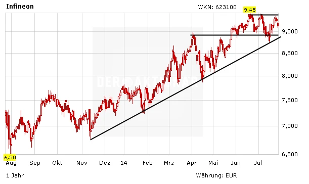 Am 30. Juli veröffentlicht Infineon die Eckdaten für das dritte Geschäftsquartal 2014. Fundamental sieht es derzeit sehr gut aus. Der DAX-Konzerns ist einer der größten Profiteure der starken Automobilbranche und dem Trend hin zu mehr mobilen Endgeräten. DER AKTIONÄR spekuliert im Real-Depot auf weiter steigende Kurse. Investierte Anleger lassen die Gewinne laufen.