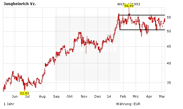Trotz der guten Zahlen, dem angehobenen Ausblick und den zahlreichen Kaufempfehlungen ist die Jungheinrich-Vorzugsaktie im Tagesverlauf ins Minus abgerutscht. Die Aktie pendelt seit Anfang des Jahres in einer Range zwischen 50 und 56 Euro seitwärts. Mit der Prognoseanhebung sollte der Kurs nun die obere Begrenzung nach oben durchstoßen.