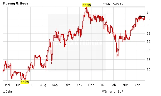 Auch wenn sich die Aktie heute im Konsolidierungsmodus befindet, ist es nur eine Frage der Zeit, bis es weiter in Richtung 40 Euro geht. Die Analysten der Privatbank Hauck & Aufhäuser kommen zu einem ähnlichen Fazit. Koenig & Bauer habe ein herausragendes viertes Quartal 2015 hinter sich, so Henning Breiter. Vor allem der Auftragsentwicklung macht Lust auf mehr. Die Planvorgaben für 2016 erschienen zu konservativ. Breiter hat die Einstufung daher auf "Buy" mit einem Kursziel von 43 Euro belassen.