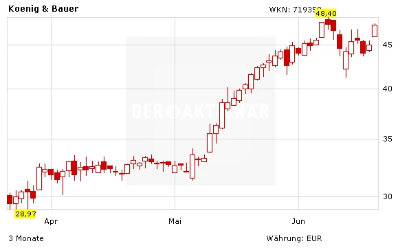 Auch bei den Analysten kam die Messe gut an. Das Analysehaus Warburg Research hat die Einstufung für Koenig & Bauer nach einem Kapitalmarkttag auf der Drupa auf "Buy" mit einem Kursziel von 50,80 Euro belassen. Die positive Stimmung auf der Druckmesse dürfte für mehr Aufträge sorgen, so Analyst Eggert Kuls. Die Nachrichtenlage um den Druckmaschinenhersteller dürfte positiv bleiben.