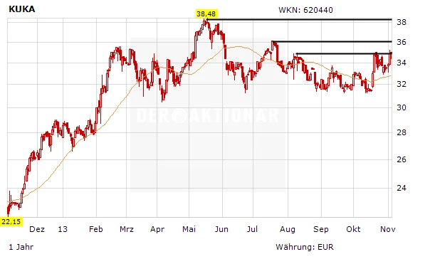 DER AKTIONÄR hat bereits auf die aussichtsreiche Situation bei KUKA hingewiesen. Mit dem Sprung über den horizontalen Widerstand bei 35,00 Euro würde ein neues Kaufsignal generiert. Die nächsten Widerstände liegen bei 36 und 38,50 Euro. DER AKTIONÄR spekuliert im Real-Depot daher mit einem KUKA-Turbo-Long (WKN CT8 W2U) von der Citigroup Hebel auf steigende Kurse.