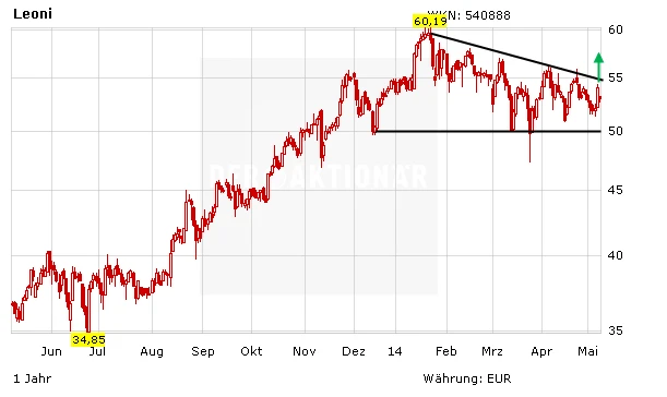 In diesem Jahr müssen die Nürnberger erneut viel Geld für neue anlaufende Projekte investieren. Um Bordnetze für neue Automodelle herzustellen, müssen Mitarbeiter geschult und Fabriken zum Teil umgebaut werden. 200 Millionen Euro Investitionen stehen 2014 auf dem Plan, die in den nächsten beiden Jahren das Wachstum beflügeln sollen. 2016 soll der Umsatz auf rund fünf Milliarden Euro steigen, davon sollen vor Zinsen und Steuern 350 Millionen Euro Gewinn bleiben. Für dieses Jahr geht Leoni von 4,1 Milliarden Euro Umsatz und einem EBIT in Höhe von mindestens 200 Millionen Euro aus. Draus resultiert ein Gewinn je Aktie von rund 4,15 Euro. Das entsprechende KGV von 13 lässt Spielraum für weiteres Kurspotenzial.
