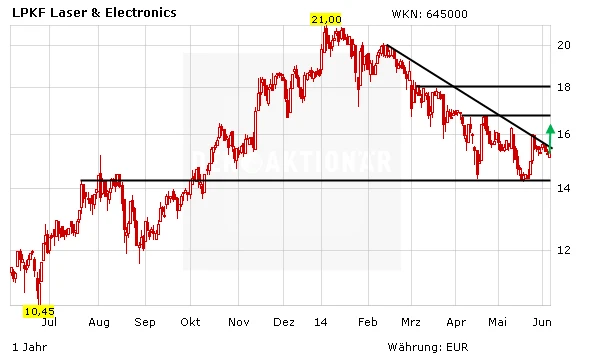 Durch die Korrektur ist die Aktie des Laser-Spezialisten nicht mehr so ambitioniert bewertet wie zu Hochzeiten. Das KGV für 2015 liegt jetzt bei 16, was angesichts der Wachstumsaussichten noch Potenzial nach oben lässt. Da die Aktie stark überverkauft ist, könnte sich vom aktuellen Niveau aus eine Trendwendeformation ausbilden. Mit dem Sprung über den Abwärtstrend würde ein Kaufsignal generiert. Die ersten Ziele der Gegenbewegung liegen dann bei 16,50 und 18,00 Euro. DER AKTIONÄR spekuliert im Real-Depot mit einem LPKF-Turbo-Bull mit Hebel auf dieses Szenario.