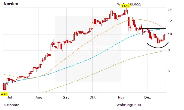 Am 7. November erreichte die Aufwärtsbewegung der Nordex-Aktie ihren vorläufigen Höhepunkt. Der Kurs markierte ein Jahreshoch bei 14,42 Euro. Seit Jahresanfang lag das Plus damals bei über 360 Prozent. Danach ging es abwärts. Doch nun deutet sich eine erneute Trendwende an.