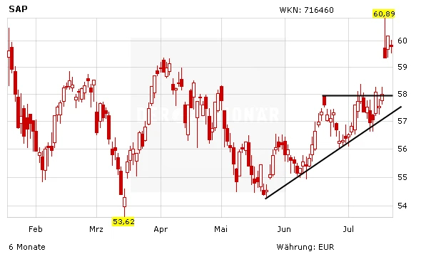 Auch SAP-Finanzvorstand Luka Mucic zeigte sich im Interview mit dem DAF Deutsches Anleger Fernsehen von den Zahlen überzeugt. Investierte Anleger bleiben dabei und sichern ihre Position mit einem Stopp bei 49 Euro ab. Das Kursziel lautet nach wie vor 75 Euro. DER AKTIONÄR spekuliert im Real-Depot weiter auf steigende Kurse. Mehr zu SAP lesen Sie in der aktuellen Ausgabe des AKTIONÄR.
