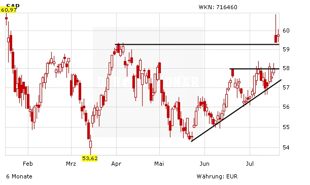 Die starke Entwicklung der Cloud-Sparte und die Bestätigung der Prognose überzeugt nicht nur die Analysten auch die Anleger dürften darüber erfreut sein. Ein freundliches Markumfeld vorausgesetzt dürfte sich die aktuelle Aufwärtsbewegung weiter fortsetzten. Investierte Anleger bleiben dabei und sichern ihre Position mit einem Stopp bei 49 Euro ab. Das Kursziel lautet nach wie vor 75 Euro. DER AKTIONÄR spekuliert im Real-Depot weiter auf steigende Kurse. Mehr zu SAP lesen Sie in der aktuellen Ausgabe des AKTIONÄR.