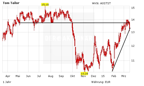 Nach den deutlichen Gewinnen im Februar konsolidierte die Tom-Tailor-Aktie zuletzt unterhalb der 14-Euro-Marke. Am Mittwoch dürfte der Wert einen neuen Ausbruchsversuch über diese Hürde starten. Auch fundamental stimmen die Aussichten. DER AKTIONÄR spekuliert im Real-Depot daher vorerst weiter auf eine Aufwärtsbewegung mit Ziel 15,00 Euro. Fällt die Aktie dagegen weiter zurück, wird die Position zeitnah verkauft.
