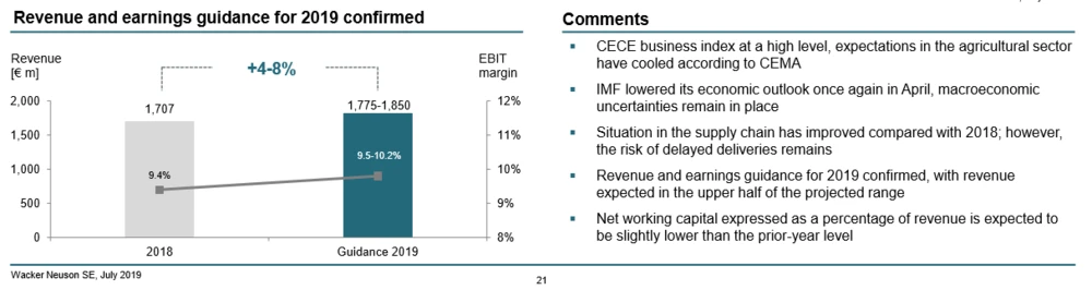 Nach dem starken Jahresauftakt, dem sehr positiven Kundenfeedback auf der Bauma und dank gut gefüllter Auftragsbücher hat der Vorstand die für 2019 prognostizierte Umsatzspanne bereits etwas nach oben angepasst.