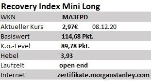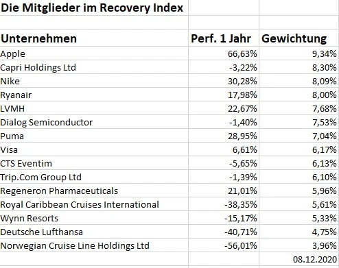 Im Recovery Index befinden sich Unternehmen, deren China-Geschäft einen hohen Anteil am Gesamtumsatz ausmacht: Luxusgüterhersteller sowie Konzerne aus der Reise- und Touristikbranche. Besonders Letztere konnten im November ordentlich zulegen, wobei positive Analystenkommentare von Goldman Sachs und Kepler Cheuvreux die Kurse beflügelten.
