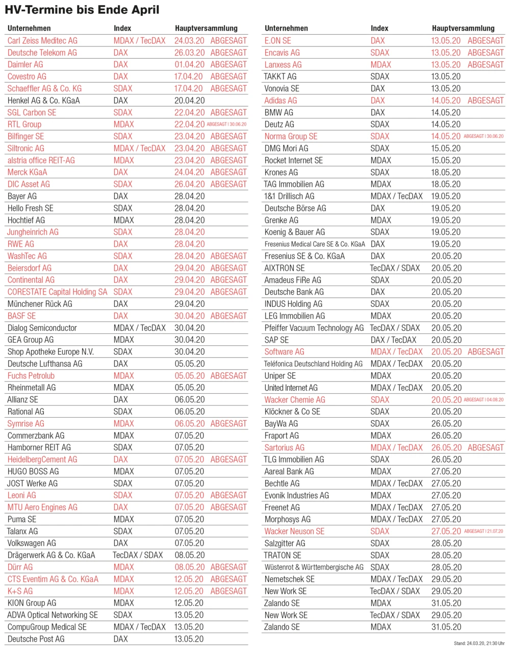 Die Einschränkung des öffentlichen Lebens, insbesondere das Verbot von Veranstaltungen, macht auch vor börsennotierten Gesellschaften nicht halt. Erste Unternehmen haben ihre bevorstehenden Hauptversammlungen bereits abgesagt respektive verschoben. Aus freien Stücken oder aber, weil ihnen Verfügungen des Staates keine andere Wahl ließen, darunter mit BASF, Deutsche Telekom, Daimler, Beiersdorf und Continental auch mehrere traditionsreiche DAX-Konzerne.