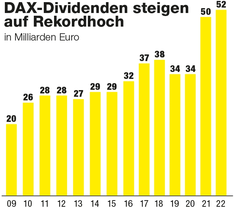 Nix gewesen, noch nicht einmal Spesen: Seit Jahren schaut Bundeskanzler Olaf Scholz als bekennender Sparbuch-Fan bei den Erträgen auf sein Erspartes in die Röhre, während am Aktienmarkt Milliarden an die Anleger ausgeschüttet werden. Und das wird auch 2023 so sein. Wie die Société Générale schreibt, hätte rund ein Viertel der 40 DAX-Konzerne sogar eine höher als erwartete Ausschüttung an die Aktionäre in Aussicht gestellt, etwa die Hälfte der Unternehmen wird ihre Dividende erhöhen. Unter dem Strich, so die Bank, steige die Ausschüttung gegenüber dem Vorjahr um drei Prozent und das, obwohl mit Linde ein besonders ausschüttungsstarker Konzern dem DAX den Rücken gekehrt hat.