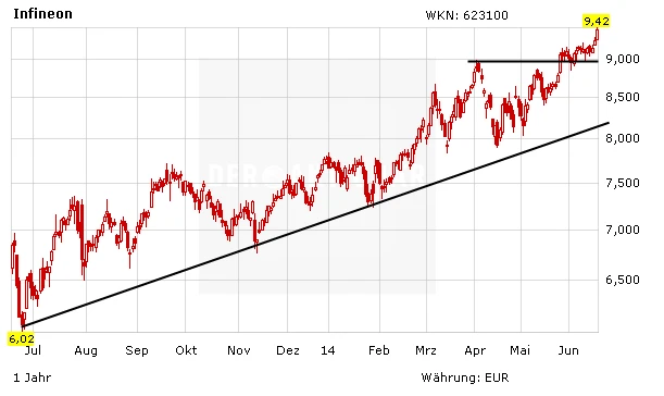 Der positive Trend der Aktie dürfte sich weiter fortsetzen. Infineon ist hervorragend aufgestellt. Der Weg in Richtung der 10-Euro-Marke wäre damit frei. Das langfristige Kursziel lautet 12 Euro. Investierte Anleger bleiben dabei und lassen die Gewinne laufen.
