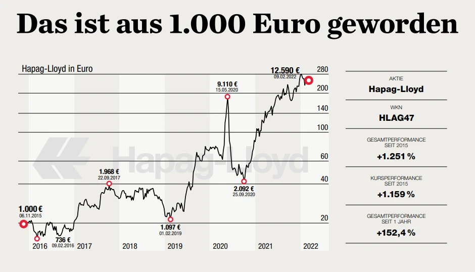 Doch auch wer erst im neuen Jahr die Börse und Aktien für sich entdeckt hat, hätte mit Hapag-Lloyd bis heute eine üppige Rendite einfahren können. Seit der Vorstellung der Hapag-Lloyd-Aktie in der Rubrik "Das wurde aus 1.000 Euro" in der Ausgabe 07/2022 vom 11. Februar kletterte der Kurs gar um 71 Prozent.