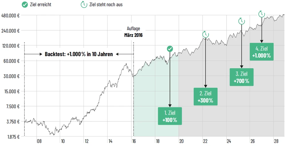 Das erst im März 2016 aufgelegte TSI USA-System ist ein Überflieger-Depot: +190 Prozent seit Auflage mit einer reinen Aktienstrategie stehen aktuell zu Buche. Die Ziele liegen indes höher: Bis 2026 soll sich das Depot verzehnfachen. Bislang wird dieser Plan deutlich übererfüllt. Bis einschließlich Donnerstag dürfen Sie einmal unverbindlich Probelesen.