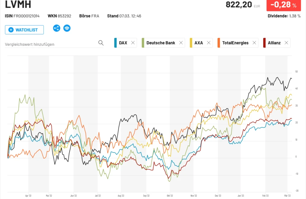 Die Kerninflationsrate ist bei den Notenbankern stark im Fokus, weil diese als ein guter Indikator für den mittelfristigen Preistrend gilt. Hohe Inflationsraten und steigende Zinsen sind eher Gift für die Börse. Trotz allem gibt es Aktien, die aufgrund Ihrer Preissetzungsmacht äußerst krisenresistent sind und besser als der DAX performen. Dazu gehören die Aktien von LVMH, Deutsche Bank, Axa, TotalEnergies und Allianz. Das Schaubild verdeutlicht die Out-Performance der einzelnen Aktien gegenüber dem DAX.