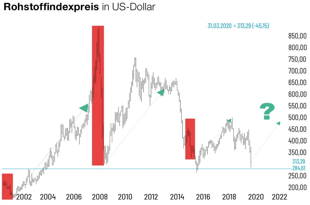 Beim Platzen der Dotcom-Blase im Jahr 2000/2001 lagen die durchschnittlichen Produktionsgrenzkosten fünf Prozent unter dem Rohstoffindexpreis. 2002 lagen die Rohstoffpreise bereits wieder 20 Prozent höher. Aktuell befindet sich der Rohstoffindexpreis auf dem Niveau der Finanzkrise 2008. Die Grenzkosten lagen damals sieben Prozent unter dem Index und stiegen 2009 auf circa 70 Prozent des Vorjahresniveaus an – exzellente Aussichten für einen erneuten Anstieg.