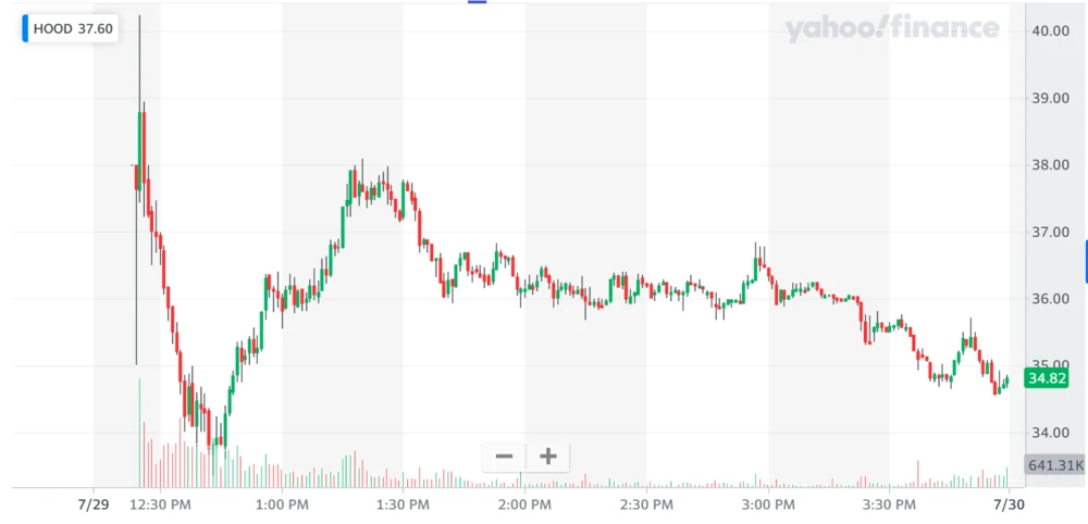 An der Börse stand die Robinhood-Aktie bereits zum Handelsauftakt mächtig unter Druck. Im weiteren Verlauf sackten die Papiere zeitweise um zwölf Prozent auf 33,35 Dollar ein. Zum Handelsschluss stand ein Minus von rund 8,3 Prozent auf 34,82 Dollar zu Buche.